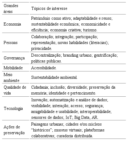 No desenvolvimento dessa análise, percebeu-se que as grandes áreas de interesse para os autores do “patrimônio inteligente” são basicamente as mesmas presentes nos estudos das cidades inteligentes, conforme apontado anteriormente, acrescentando-se somente as ações de preservação patrimonial propriamente ditas, conforme descritas na Tabela 2.