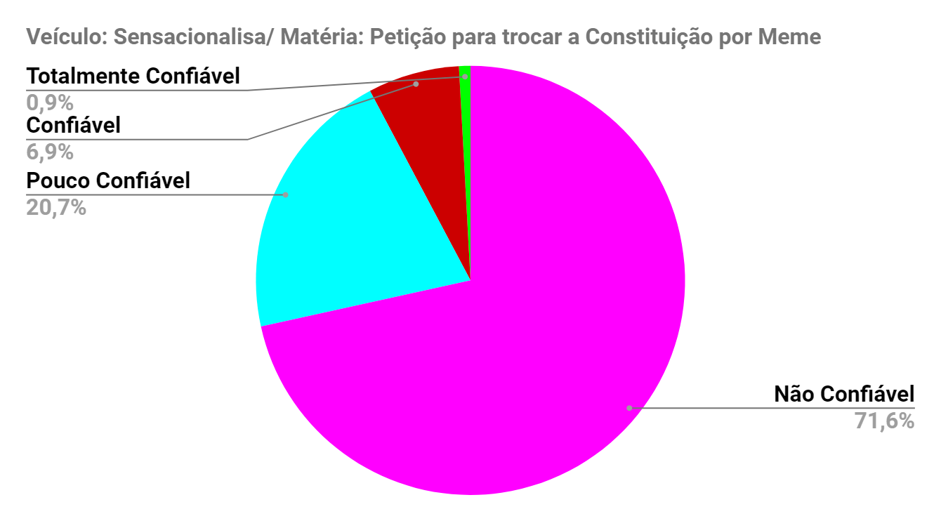 Por isso, foi primordial para esta pesquisa que os bibliotecários pudessem classificar diferentes notícias de veículos de informações quanto ao nível de confiança do conteúdo, especialmente para fins de utilização na sua atividade laboral. O Gráfico 8 faz alusão às respostas referentes a uma notícia do site Sensacionalista que dava conta de uma petição para trocar a Constituição por meme. A maioria dos respondentes (71%) afirmou que a notícia não era confiável. Salienta-se que o próprio site já anuncia ser isento de verdade, uma vez que tem a finalidade de produzir e difundir sátiras.
