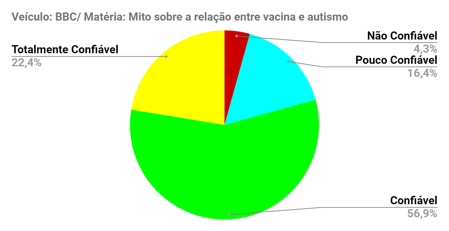 de confiança a respeito de uma matéria da BBC que reflete sobre o mito da relação entre autismo e vacina. 80% dos respondentes a classificaram como confiável ou totalmente confiável. Estima-se que aplicaram os critérios de avaliação da informação, destacando-se aqueles relacionados a precisão e relevância (implicações), já que acenaram para a confiabilidade de uma notícia que usa resultados de pesquisas científicas para embasar a sua argumentação.