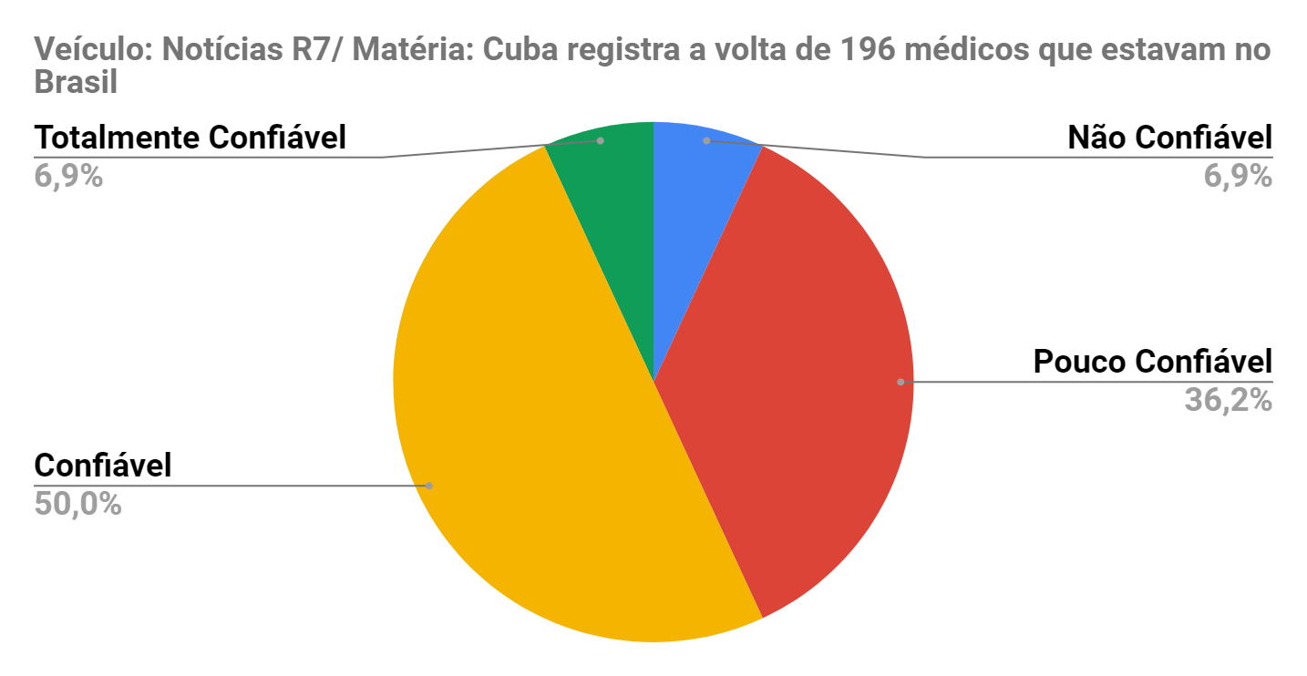 Já o Gráfico 10 representa a avaliação da matéria intitulada Cuba já registra a volta de 196 médicos que estavam no Brasil, veiculada no site R7 Notícias. Neste caso, 50% dos respondentes disseram que a notícia era confiável, mas uma quantidade considerável (37%) optou por considerá- la não confiável ou pouco confiável. Isso leva a crer que esses respondentes analisaram apenas uma única fonte, que foi aquela disponibilizada por esta investigação, pois a notícia também foi veiculada em outros portais de notícias, dentre eles o site da revista IstoÉ, com o título Retornam a Cuba primeiros 196 médicos que estavam no Brasil (2018). Essa escolha, portanto, contradiz a afirmação, feita antes pelos respondentes, de que pesquisam em mais de uma fonte para atestar a confiabilidade das informações.