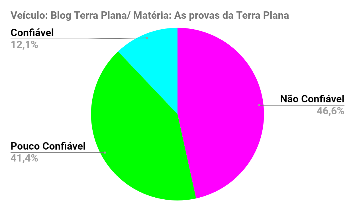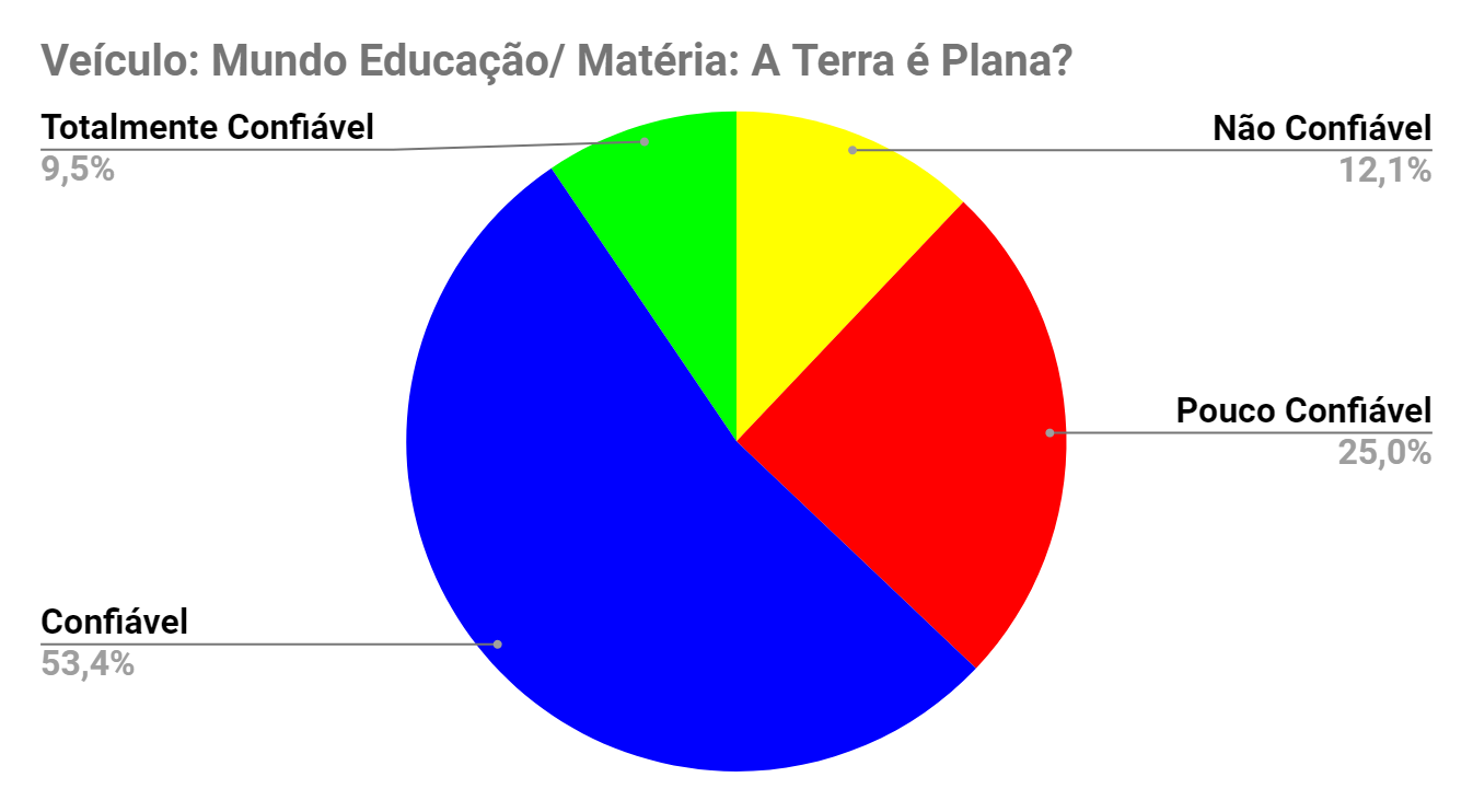 A matéria Terra plana, publicada por blog homônimo, deu origem aos dados do Gráfico 11. Aqui se observa que 47% dos respondentes consideraram a matéria como não confiável e 41%, como pouco confiável; não obstante, 12%