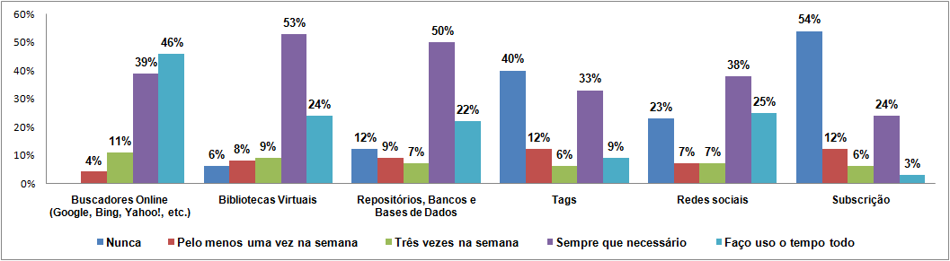 usuário, convencendo-o a usar os serviços da unidade na qual esses bibliotecários laboram. Admite-se que esses profissionais selecionam e avaliam recursos imprescindíveis que colaboram para uma resposta assertiva aos usuários. Dentre esses recursos, ganham destaque os buscadores online, que 46% dos respondentes declararam usar o tempo todo e que 39%, por outro lado, sinalizaram usar em situações em que sentem necessidade. Esse dado é bastante pertinente, tendo em vista que, com o avanço das TIC, cada vez mais se torna inevitável o uso da internet para pesquisas diversas, conforme ratificam Lemos e Lévy (2010). Em relação às bibliotecas virtuais, mais de 50% responderam que faziam uso delas apenas quando necessário. Já quando se trata de repositórios, bancos ou bases de dados, 50% dos respondentes disseram fazer uso sempre que necessário.
