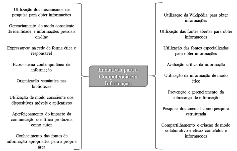 Com vistas a sintetizar as vertentes das temáticas da competência em informação estudadas na Itália e que se fizeram presentes no estudo bibliográfico realizado para os fins deste trabalho, a figura a seguir ilustra tais vertentes, sugerindo um olhar atento de investigadores interessados no que se tem estudado na área no contexto italiano.