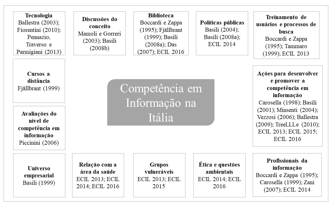 Com os documentos recuperados nesta pesquisa, foi possível atender ao terceiro objetivo específico, ou seja, identificar as temáticas apresentadas nos documentos publicados. Assim, foram identificados estudos italianos relacionando a competência em informação com: tecnologia; aspectos voltados às bibliotecas; preocupação com as políticas públicas inexistentes ou insuficientes; treinamento de usuários e processos de busca de informação; ações práticas; relações com os profissionais da informação; questões éticas e ambientais; grupos vulneráveis ― como imigrantes e deficientes; a área da saúde; o universo empresarial, entre outros elementos.