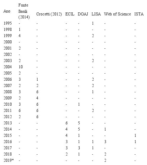 Por meio do quadro a seguir, é possível visualizar os resultados do levantamento bibliográfico obtido a partir dos trabalhos de Basili (2014) e de Crocetti (2012), das bases de dados DOAJ, LISA e Web of Science, ISTA e da ECIL.