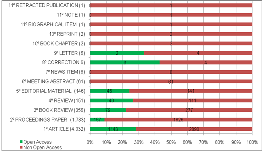 Apesar de haver evidente destaque dos documentos publicados em periódicos e anais de eventos, pode-se verificar que há outros formatos indexados na base: Meeting Abstract (0,95%), News item (0,12%) Correction (0,11%), Letter (0,09%), Book Chapter e Reprint (0,03% cada) e Biographical item, Note e Retracted Publication (0,02% cada). E são documentos cuja forma de acesso majoritariamente é feita por assinatura (57,14% Correction, 66,67% de Letter, 71,68% de Article, 73,51% de Review, 77,81% de Book Review, 91,19% dos Proceedings Paper, 96,57% de Editorial material e 100% dos demais tipos documentais). Dos formatos que concentram o maior volume de documentos, apenas 28,34% (1.143) dos artigos e, 8,80% (157) dos Proceedings Paper estão disponíveis em acesso aberto (Figura 1).