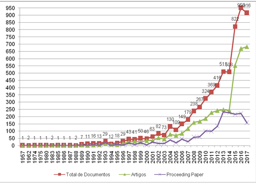 Após os anos 2000, é possível observar uma mudança no volume de publicações ao observar a curva de crescimento de documentos indexados sobre CoInfo (de 46 em 2000 a 916 em 2017). Em meados dessa década o número de publicações anuais ultrapassa uma centena (130 em 2004) e segue um crescimento constante, resultando em 20,77% do total de documentos publicados no período. Um crescimento similar é observado no estudo de González-Valiente (2014) sobre a produção científica cubana em CoInfo, e nos estudos de Dudziak (2010), Pinto, Escalona-Fernández e Pulgarín (2013) e Majid et al. (2015), cujos resultados reforçam o crescimento no volume de publicações na temática em meados dos anos 2000.