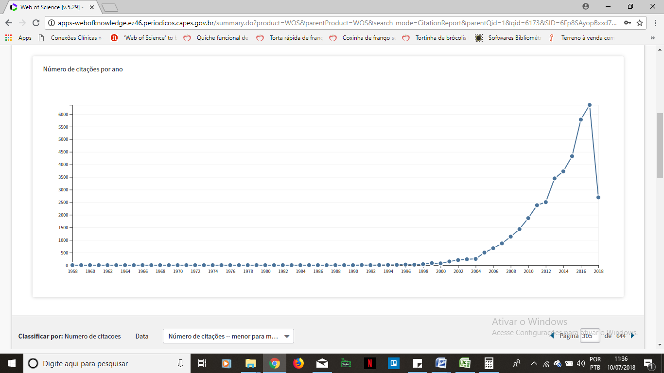 Uma curva similar é observada no crescimento do número de citações anuais a estes documentos, inferior a 11 até 1994 e superior a 100 a partir de 2001 (147), chegando a 6.363 citações no ano de 2017 (Figura 3), totalizando (até julho de 2018) 38.804 citações entre os 6.434 artigos sobre CoInfo indexados em WoS, uma média de 6,03 citações por item, média superior a observada por Bhardwaj (2017), de cinco citações por documento.
