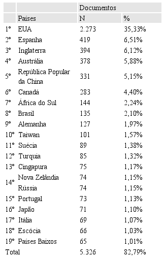 Dentre a nacionalidade de origem das publicações, foram identificados 112 países (Tabela 1), o que comprova a expansão da disciplina em termos geográficos, como observado anteriormente por Pinto, Escalona-Fernández e Pulgarín (2013) e Majid et al. (2015). No entanto, 92 destes países contribuem com menos de 1% dos documentos indexados na base, dos quais 19 publicaram apenas 1 documento, 7 países publicaram 2, 26 países de 3 a 10 documentos e os demais (40 países) publicaram entre 12 e 63 documentos.