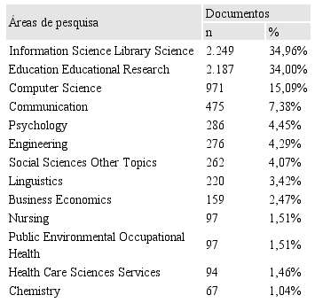 Ao estudar as áreas nas quais tais documentos são publicados, foram identificadas 117 áreas em que estes estão indexados na WoS. Entre estas, há três áreas do conhecimento que se destacam entre os documentos publicados sobre CoInfo. A área de Information Science, Library Science é a categoria que reúne o maior número de documentos sobre a temática, 2.249 (34,96%), seguida pela área de Education, Educational Research, 2.187 (34%) e pelos documentos categorizados em Computer Science, 971 (15,09%).