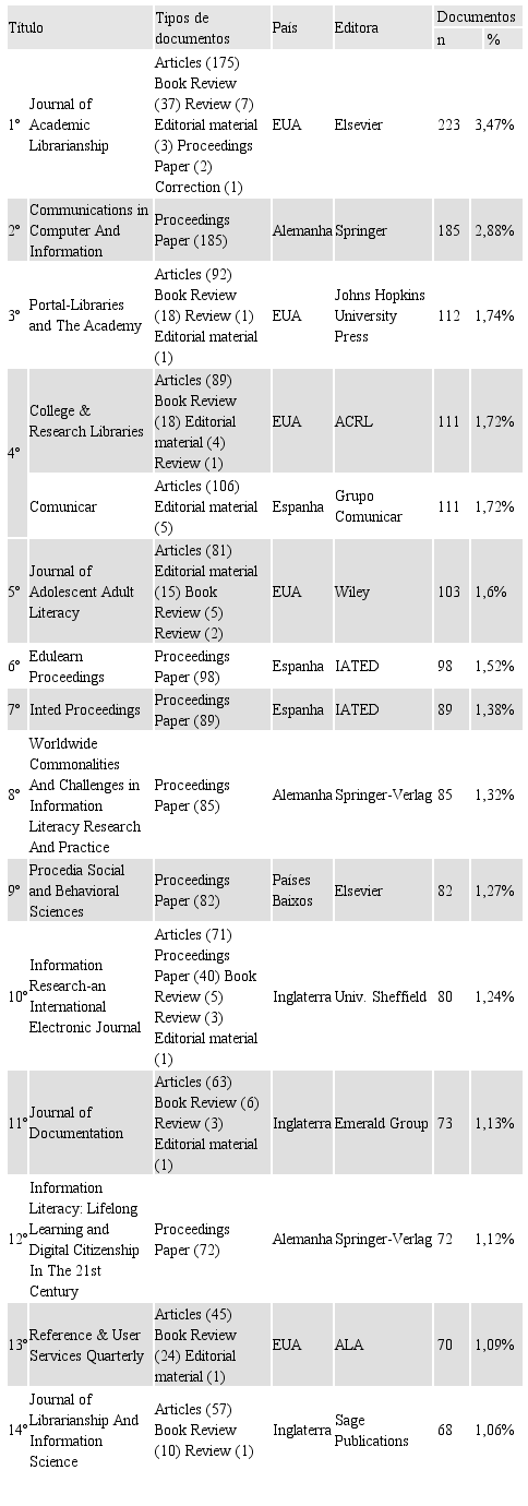 Em rankings anteriores, também se destacaram: Information Research- An International Electronic Journal (KUMARI; MADHUSUDHAN; ALI, 2015), Journal of Documentation (KUMARI; MADHUSUDHAN; ALI, 2015; KOLLE, 2017), Reference & User Services Quarterly (DUDZIAK, 2010), Journal of Librarianship and Information Science (DUDZIAK, 2010; KUMARI; MADHUSUDHAN; ALI, 2015), igualmente listados no ranking da Tabela 3.
