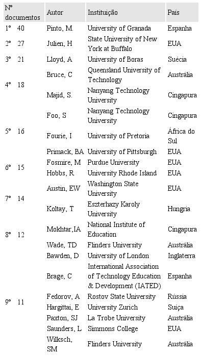 O autor com maior produtividade no tema é Maria Pinto, que publicou 40 documentos e possui vínculo com a Universidade de Granada, na Espanha. A autora possui 13 trabalhos de diferença do segundo colocado no ranking (Quadro 1), sendo também identificada como a mais produtiva na temática nos estudos de Bhardwaj (2017), Kolle (2017), Majid et al. (2015) e Pinto, Escalona-Fernández e Pulgarín (2013). A segunda colocada, Heide Julien, filiada à State University of New York at Buffalo, nos EUA, é autora de 27 dos documentos sobre CoInfo, e é identificada nos estudos de Dudziak (2010) e Kumari Ali e Madhusudhan (2015) como a autora mais citada na temática, seguida por Maria Pinto. AnneMaree Lloyd, Christine Bruce e Ina Fourie também aparecem nas 3ª, 4ª e 5ª colocações do estudo de Kumari, Ali e Madhusudhan (2015).