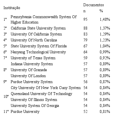 As 16 instituições (0,47%) com maior números de menções, superior a 50 documentos, compõem o ranking das instituições com o maior número de documentos publicados. Destas, 12 são norte-americanas, incluindo as cinco primeiras colocadas no ranking, dentre as quais Pennsylvania Commonwealth System Of Higher Education, ocupa a primeira posição com um total de 95 documentos publicados (Tabela 5).