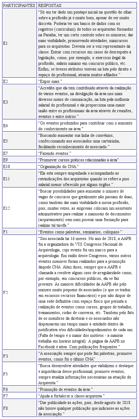 Posteriormente, foi questionado: “Caso sua resposta tenha sido sim, quais atividades você destacaria como contribuição? E, caso sua resposta tenha sido não, de que maneira a AAPB poderia melhorar seu desempenho, quais atividades ela poderia executar visando contribuir com a Classe Arquivista?” As respostas serão apresentadas em um quadro a seguir, com exceção das respostas dos participantes E6 e E8, que não responderam, e do participante F4, que afirmou não conhecer a AAPB.