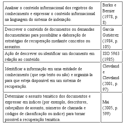 Em suma, os significados se aproximam de vocábulos muito utilizados para representá-las, traduzidos na forma de verbos de ação, tais como: “[...] reter, extrair, captar, resumir, descrever, caracterizar, escolher, analisar, identificar, traduzir, indexar, indicar, interpretar [...]”, dentre outros (GIL LEIVA, 2012, p. 68). Nesse sentido, apresenta-se o Quadro 1, o qual o quadro expõe outras definições de indexação, de modo a reforçar e complementar essa diversidade.