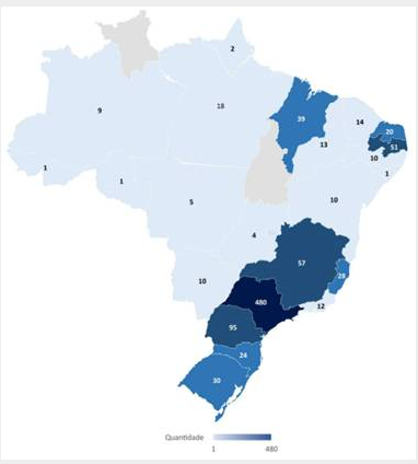 Por meio do endereço profissional, também foi possível identificar onde os descendentes do PPGCEM/UFSCar estão atuando no Brasil. Na Figura 5pode ser observado que estão presentes em praticamente todo território brasileiro, ou seja, 23 Estados. A maior concentração está em São Paulo, seguido por Paraná e Minas Gerais.