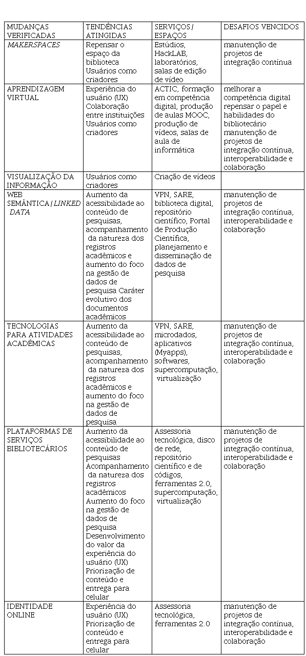 É possível afirmar que, para a implementação desses serviços, alguns dos desafios levantados nos relatórios foram vencidos, como pode ser verificado na permanência de projetos de integração contínua e de colaboração. Merece destaque, para a presente pesquisa, a redefinição do papel do bibliotecário, especialmente em relação à sua atuação como educador no contexto digital nas estratégias de aprendizagem virtual. Paralelamente, a biblioteca avança na direção de cumprir o desafio de melhorar a competência digital da comunidade acadêmica.
