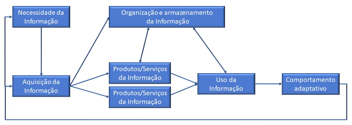 No caso do INSS, a necessidade gera a aquisição de informação, que gera produtos e serviços a partir dessa informação, os quais, uma vez utilizados, criam um comportamento adaptativo. Esse comportamento adaptativo é uma forma eventual de aquisição da informação (“fulano faz assim, vou fazer igual”). Porém, nem toda a informação adquirida é organizada e armazenada. Nem toda informação armazenada gera produtos e serviços e vice-versa. A informação armazenada apenas alimenta o uso.
