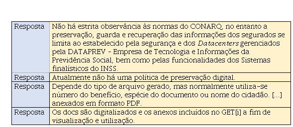 Quanto às informações da gestão de documentos, após a implantação do novo sistema de atendimento, e quanto ao tratamento do acervo documental, indagou-se pela observância, com a consolidação do INSS Digital, às normas do CONARQ de preservação, guarda e recuperação das informações (metadados estabelecidos) dos segurados, e também se perguntou se existia uma política de preservação digital estabelecida na instituição, conforme se observa no Quadro 1.