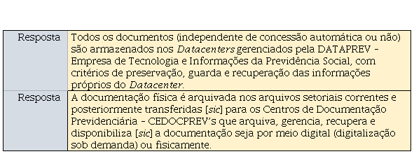 Quanto à gestão de documentos dos procedimentos técnicos internos, a implantação do modelo de atendimento baseado no processo digital trouxe a necessidade de criar, também, uma nova forma de analisar os processos e a documentação que lhe servem de subsídio, uma vez que não é mais feita uma análise física dos documentos. Perguntou-se à instituição de que forma ela recebe e guarda a documentação física dos requerentes no ato de solicitação de benefícios, agora no modelo digital, e também como ela gere os documentos físicos sob sua guarda até a virada para o modelo digital. O Quadro 3 mostra as respostas.