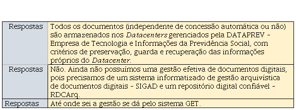Considerando-se as respostas obtidas, percebe-se claramente que se adota fluxo de tratamento da documentação diverso daquele determinado pelo CONARQ, especialmente a partir da implantação do INSS Digital. Isso deixa muito clara a fragilidade a que os documentos digitais estão expostos em função da não adoção de uma cadeia de custódia completa. No que tange à preservação dos documentos físicos, percebe-se um fluxo e uma preocupação condizentes com o que é estabelecido, com muito ainda a ser melhorado, mas com uma probabilidade muito maior e mais segura de recuperação da informação.