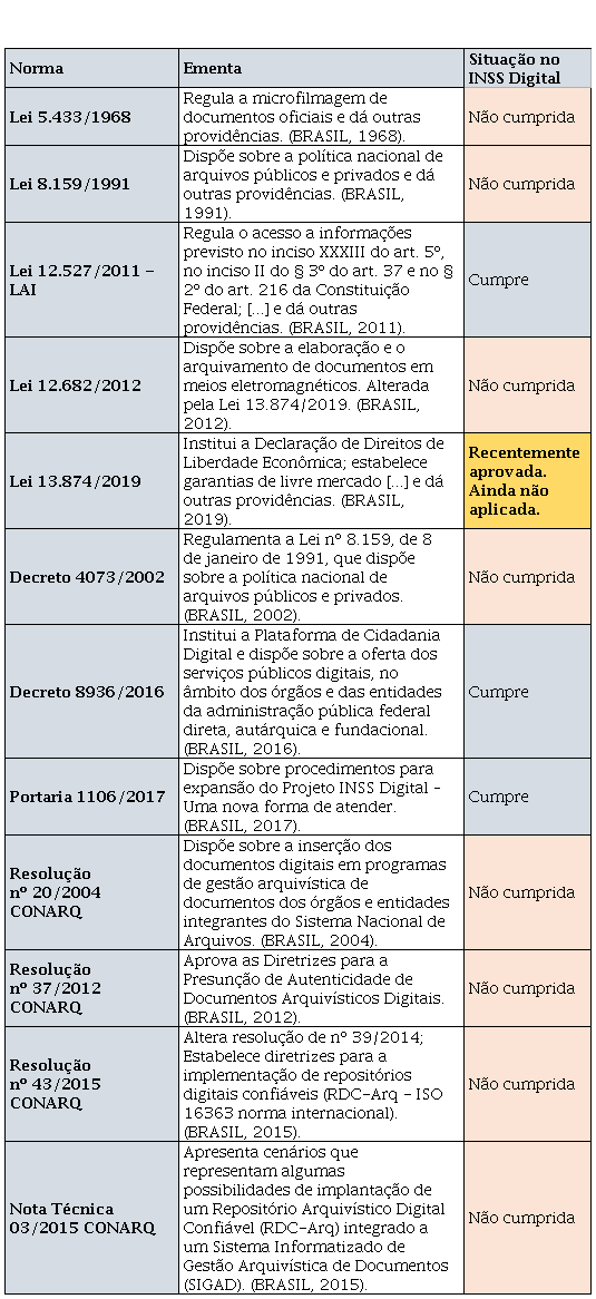 Por fim, ao relacionarem-se as respostas fornecidas pela administração central e pelos servidores de nível operacional, percebe-se que não existe um fluxo de informação claro entre eles. A gestão da informação na instituição não está ocorrendo de forma adequada, o que compromete a qualidade nos serviços prestados aos cidadãos. Com relação ao cumprimento dos normativos que embasam o objeto de estudo deste trabalho, apresenta-se no Quadro 5 a situação da autarquia até o presente momento.