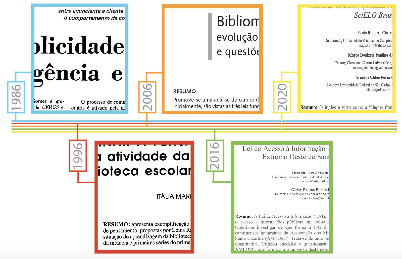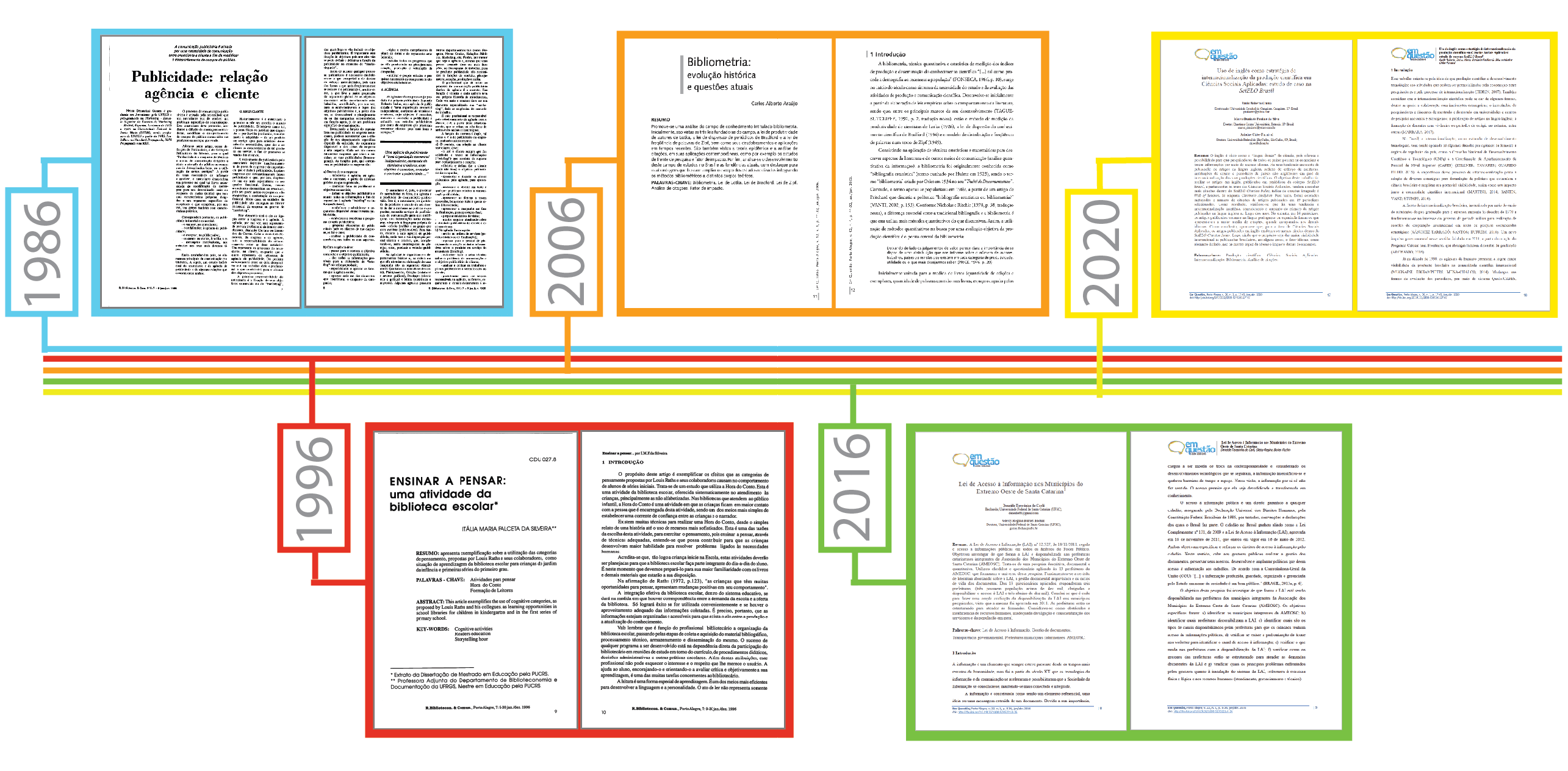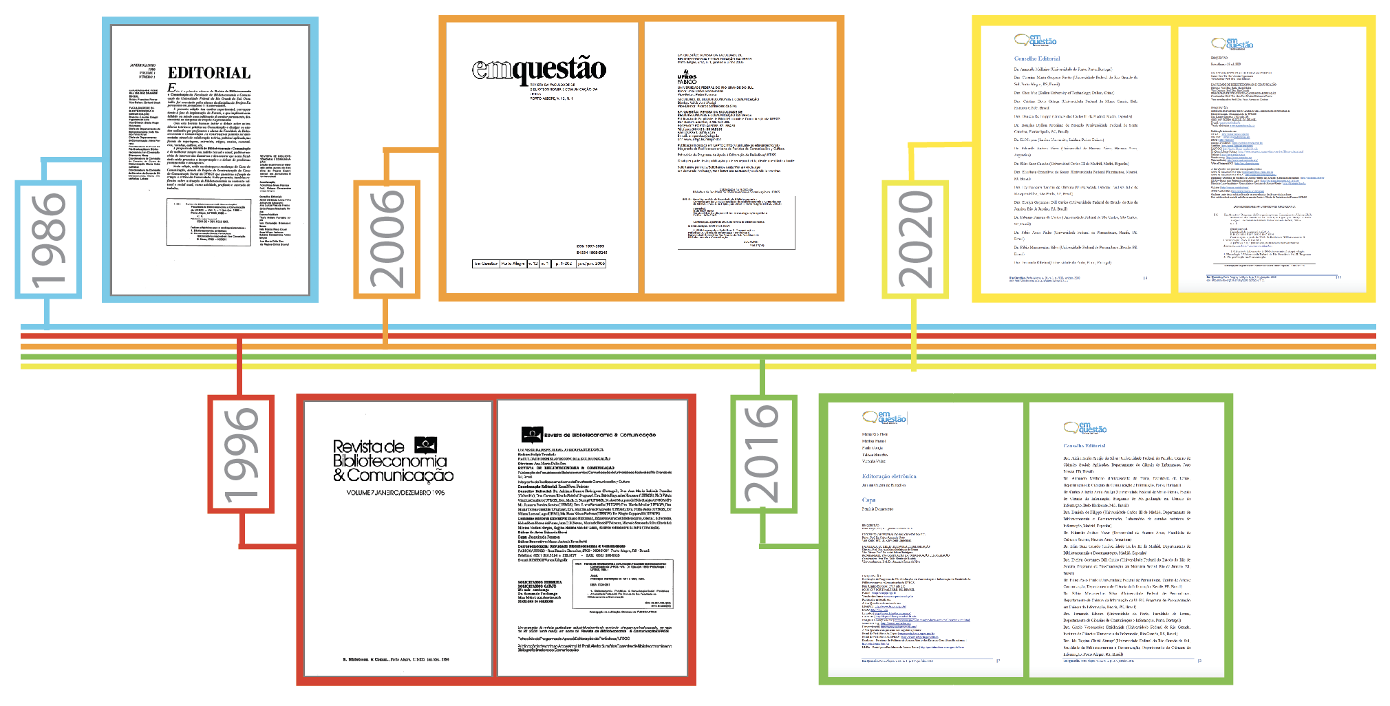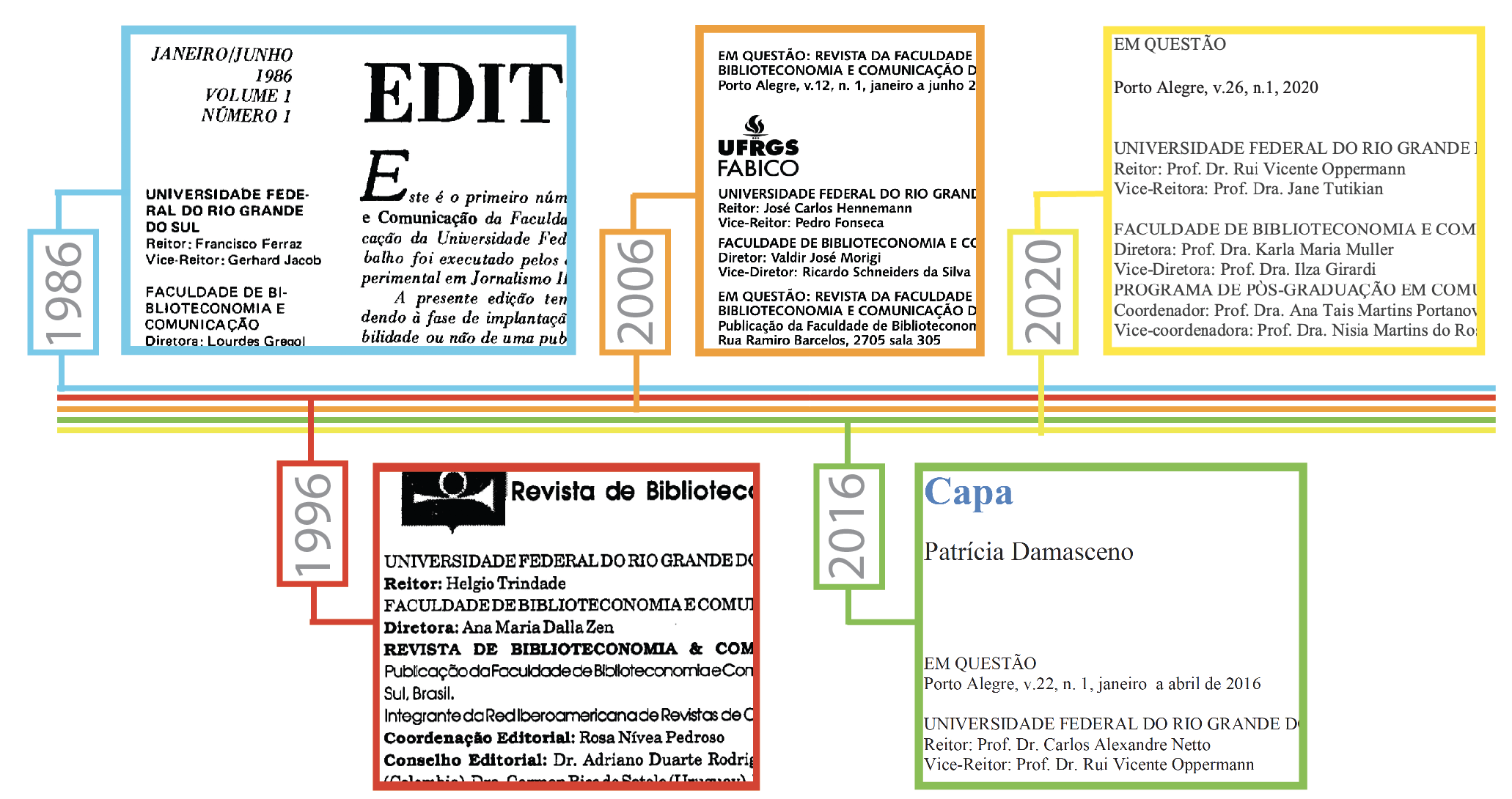 As imagens componentes do estudo foram retiradas do site da revista (https://seer.ufrgs.br/EmQuestao/index) e também do site do Centro de Documentação e Acervo Digital da Pesquisa da Universidade Federal do Rio Grande do Sul (CEDAP) (https://cedap.ufrgs.br/jspui/), que hospeda as edições de 1986 até 2000. Para a ancoragem da discussão sobre a evolução histórica do projeto editorial, foram criadas imagens em forma de linha do tempo, apresentando os cinco anos-base definidos. Para cada categoria de análise foram elaboradas as linhas do tempo necessárias para representar visualmente a parte da revista observada (amostra) e elucidar as análises e inferências descritas. Foram utilizadas as cores da identidade visual da Em Questão na composição, no intuito de aproximar ainda mais a abordagem da própria revista.
