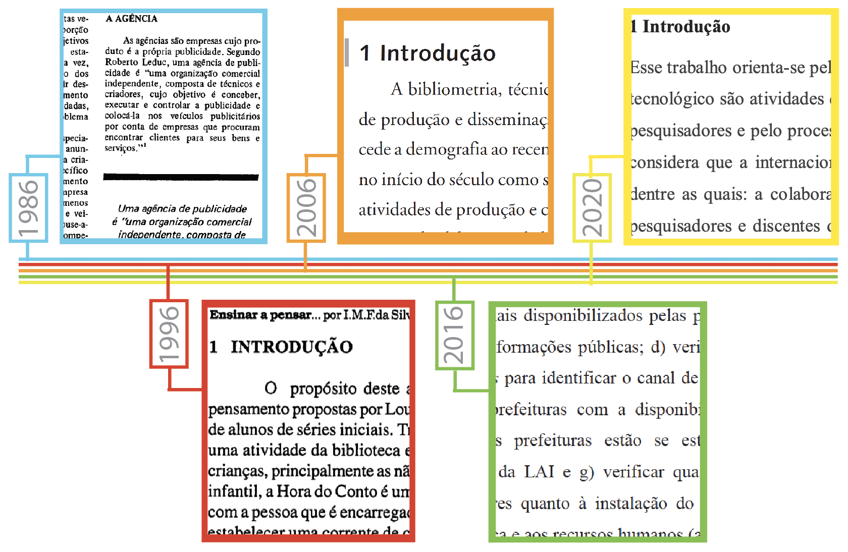 Para realizar a análise da evolução do projeto editorial na categoria diagramação do miolo, foi necessário elaborar duas imagens de linha do tempo, com dois tipos de materiais retirados da amostra: uma mostrando as páginas editoriais do miolo das revistas e outra mostrando as páginas de artigos.