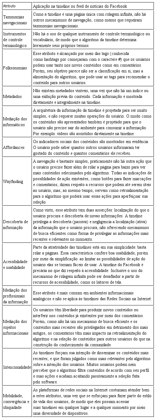 Com base nessas características, cabe aferir se eles são suficientes ou não para o atendimento dos atributos da Encontrabilidade da Informação e, com essa aferição, buscar compreender o propósito desses ambientes. O Quadro 1 apresenta a análise da relação das timelines e dos feeds de notícias com cada atributo.