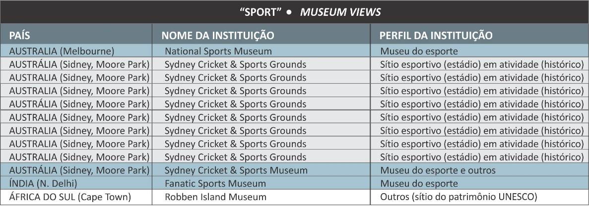 Dentre as duas instituições fora da Austrália que oferecem “museum views”, apenas uma pode ser considerada um museu do esporte. Trata-se do “Fanatic Sports Museum”, uma pequena instituição privada, fundada em 2017, na Índia, a partir da coleção formada pelo professor e pesquisador Boria Majumdar, Doutor em História do Cricket. A visita ao “Robben Island Museum”, na África do Sul, consiste em uma visita virtual a um campo esportivo pertencente a um complexo prisional desativado9 e nomeado pela UNESCO como patrimônio da humanidade em 1999.