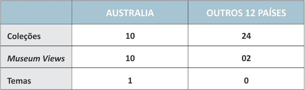 Embora as possibilidades e combinações possíveis de busca sejam diversas, especialmente dentro do universo de instituições localizadas, as quais têm parcerias firmadas com o Google Arts Institute, chama atenção a proporção das instituições australianas, frente ao número de instituições dos outros 12 países em que encontramos coleções e instituições relacionadas ao patrimônio esportivo. Os dados aqui compilados revelam que, a Austrália reúne cerca de um terço do total das coleções, considerando que as dez coleções encontradas no país representam o dobro do número de coleções dos EUA, local que aparece em segundo lugar – assim como dez das 12 “museum views”. Além disso, se refere a este país o único “tema” dentre os 112 temas que abordam o esporte e que se encontram disponíveis na plataforma Google Arts & Culture no período de nossa pesquisa, como aponta a tabela 2 abaixo.