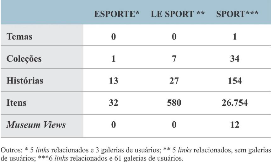 Em busca de localizar os museus, coleções e outros bens do patrimônio esportivo no contexto da ferramenta Google Arts & Culture, pesquisamos, a partir da página de abertura do website, a palavra “esporte” em português e suas traduções, “le sport” (francês) e “sport” (inglês). Os resultados encontrados, para cada uma das buscas mencionadas, encontram-se compilados na Tabela 1 abaixo.