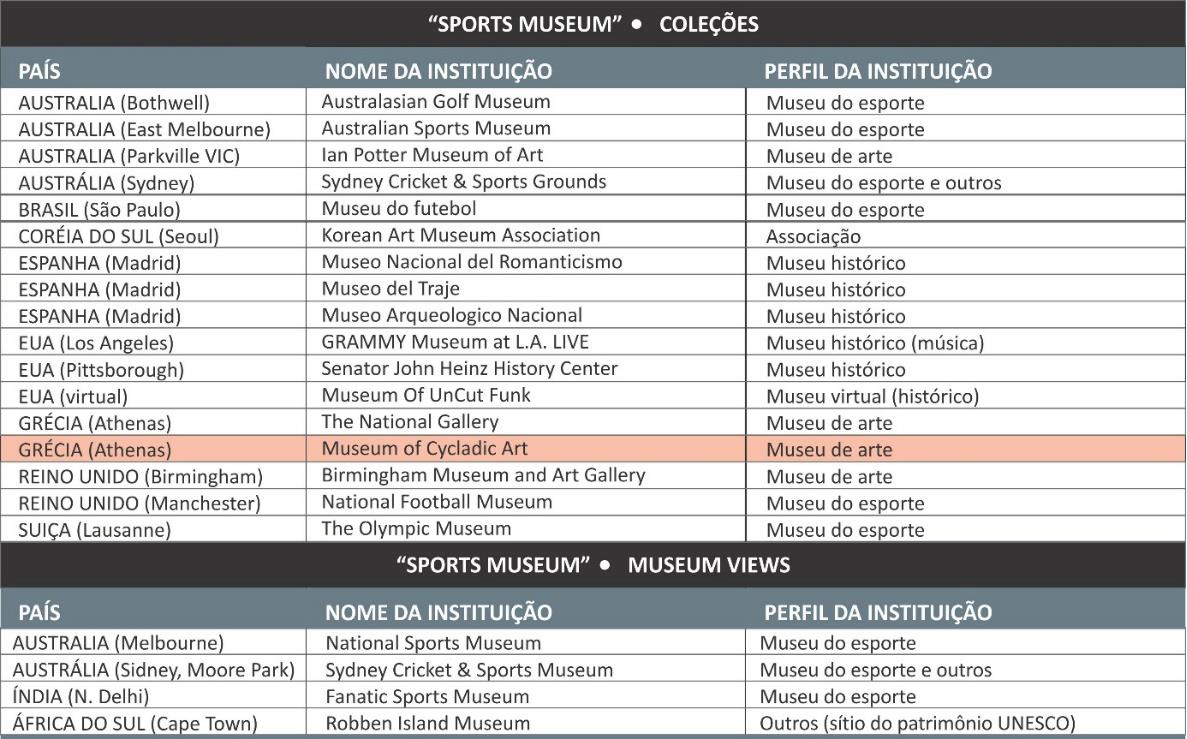 A fim de apoiar esta afirmação, realizamos uma busca na plataforma Google Arts & Culture pela palavra “museum”, que resultou numa lista de 1.201 instituições e suas coleções. Na mesma ocasião, a busca por “sport museum” resultou em 18 instituições (coleções), as quais, com exceção do museu (de arte) Museum of Cycladic Art (assinalado em vermelho), situado em Atenas, na Grécia, também haviam sido localizadas na busca anterior por “sport” (Quadro 1). No entanto, dentre estas 18 instituições encontradas, apenas seis delas são, de fato, museus do esporte. Isso indica que os museus do esporte representam apenas 0,5% dos museus associados à plataforma Google Arts & Culture. A título de exemplo, no contexto dos 3884 museus brasileiros listados pela Plataforma MuseusBr – ferramenta de buscas que centraliza informações sobre os museus brasileiros, chancelada pelo Instituto Brasileiro de Museus (IBRAM) -, a nossa pesquisa identificou 48 museus do esporte, número que representa 1,28% do total museus do Brasil10.