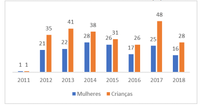 Desde sua criação, em 2011, até o ano de 2018, a CA já realizou mais de 2.100 atendimentos e abrigou 156 mulheres e 248 crianças e adolescentes, como mostra o gráfico 1.