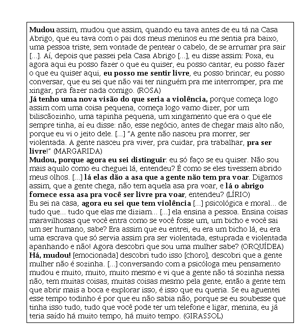 Destaca-se, ainda nessa questão, a fala de Orquídea, a qual evidencia as oficinas ocorridas na Casa Abrigo. De fato, durante tal atividade, as informações são de extrema relevância para as mulheres, pois, assim como relata a interlocutora, influenciam positivamente na vida da mulher, como reproduzido na sua fala: