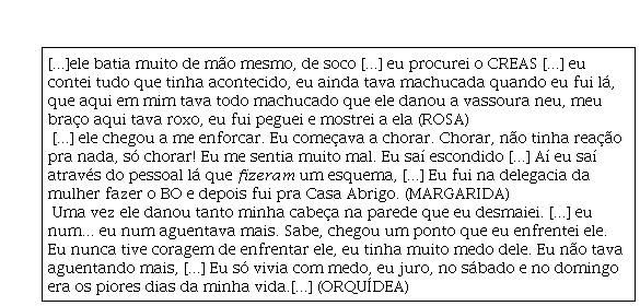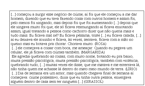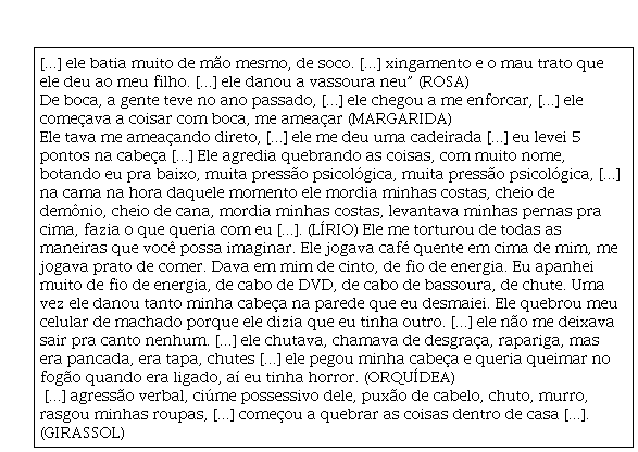 Pensando nisso, solicitou-se às mulheres que contassem um pouco sobre suas experiências, e elas trouxeram relatos dolorosos nos quais as diferentes tipificações da violência doméstica estavam presentes.