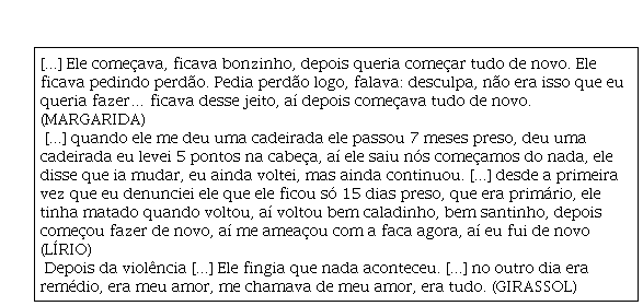 Apesar da extrema violência, é visível que as interlocutoras, em determinados momentos, conseguiram solicitar ajuda externa e romper com a situação de violência. Todavia, destaca-se que esse não é um processo simples. Em muitos casos, a mulher ameaça fazer a denúncia, mas o agressor finge que está arrependido e promete que a cena não irá se repetir. É, então, que o ciclo da violência passa para a sua fase 3, a chamada de Lua de Mel.