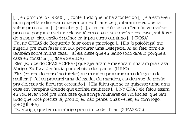 Ainda que de forma resumida, os relatos das interlocutoras explicitaram que as informações mediadas nos órgãos influenciaram a decisão de se encaminharem para a CA. No caso de Margarida, verificou-se que o medo de perder o direito à sua casa foi um dos fatores que a fizeram pensar em desistir de ir ao abrigo. Porém, a partir da mediação consciente da psicóloga, ela não se intimidou e foi.