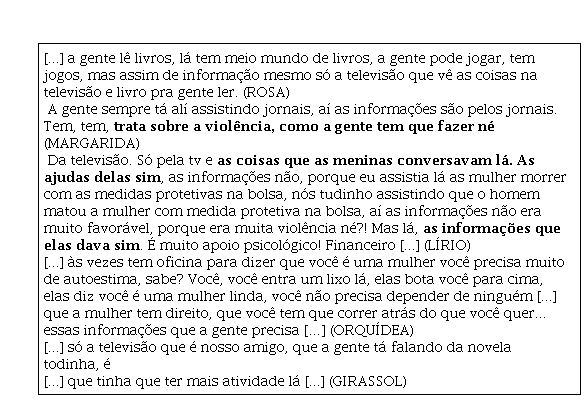 No tocante às informações acessadas na CA, quatro das cinco entrevistadas citaram a televisão como fonte de informação. Percebe-se que as mulheres consideram informação o que é reproduzido pela televisão, e citam jornais e novelas. Rosa cita os livros, mas reforça que informações só acessava pela televisão mesmo. Lírio, apesar de também citar a televisão, considera desfavoráveis os conteúdos reproduzidos nessa fonte, pois assistia, junto às outras abrigadas, casos de mulheres morrendo com medidas protetivas na mão.