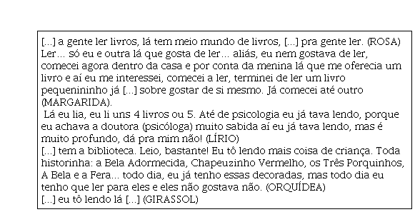 Percebe-se que a leitura não era algo presente no cotidiano das mulheres e que o contato com os livros e o tempo livre que elas tinham no abrigo, conciliados, proporcionaram momentos de prazer e descobertas por meio dessa atividade. Nesse aspecto, Almeida Júnior e Bortolin (2008) consideram a leitura como parte intrínseca do processo de apropriação da informação, no qual o compartilhamento do ato de ler torna-se a ‘receita’ perfeita para o desencadeamento do gosto pela leitura.