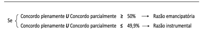 No questionário, as possibilidades de resposta, que correspondem à uma escala Likert, são: 'Concordo plenamente'; 'Concordo parcialmente'; 'Indiferente'; 'Discordo parcialmente'; 'Discordo plenamente'. Considerando a hipótese da pesquisa, maior ênfase foi dada às respostas registradas nas opções 'Concordo plenamente' e 'Concordo parcialmente' juntas, porque elas revelam se os usuários da informação tendem a experimentar o uso dos serviços e recursos informacionais na(s) biblioteca(s) universitária(s) no contexto da razão emancipatória. Assim, se o valor percentual da união (U) de 'Concordo plenamente' com 'Concordo parcialmente' for maior ou igual (≥) a 50%, classifica-se como razão emancipatória. Caso ocorra o contrário, isto é, o valor percentual de U for menor ou igual (≤) a 49,9%, indica-se, então, a razão instrumental.