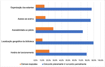 A Figura 1 evidencia que é significativamente superior a 50% o percentual de usuários da informação que, juntos, concordaram plena e parcialmente com a experiência que têm em bibliotecas universitárias nas seguintes categorias: 'Horário de funcionamento' (78,8%), 'Localização geográfica da biblioteca' (89,4%), 'Acessibilidade ao prédio' (72,7%), 'Acesso ao acervo' (84,9%) e 'Organização das estantes' (86,4%). Desse modo, entendemos que o tema 'Acesso/organização da biblioteca e do acervo' está em consonância com a razão emancipatória.