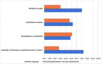 Os estudantes foram questionados se concordam com a qualidade, conservação e quantidade de itens no acervo. Assim, 24,2% dos alunos concordaram plenamente e 48,5% deles, parcialmente. Os que indicaram indiferença representam 7,6% do total. Depois, 18,2% deles discordaram parcialmente e 1,5%, totalmente.