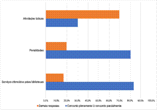 Depreendemos da leitura da Figura 3 que 83,3% dos sujeitos da pesquisa concordaram plena e parcialmente com os serviços que a(s) biblioteca(s) universitária(s) oferece(m). No que tange às penalidades aplicadas por elas, 80,3% deles concordaram que a biblioteca os penaliza com multas e suspensões para empréstimo. Além disso, 69,7% deles discordaram e são indiferentes às atividades lúdicas (quebra-cabeça, jogos de tabuleiro etc.) desenvolvidas na(s) biblioteca(s) do(s) campus, mas seu percentual de concordâncias plena e parcial corresponde a 30,3%, valor menor que o limite de 49,9%. Portanto, a categoria 'Atividades lúdicas' vai em direção à razão instrumental e devido a isso o tema 'Serviços' não está integralmente voltado à razão emancipatória.