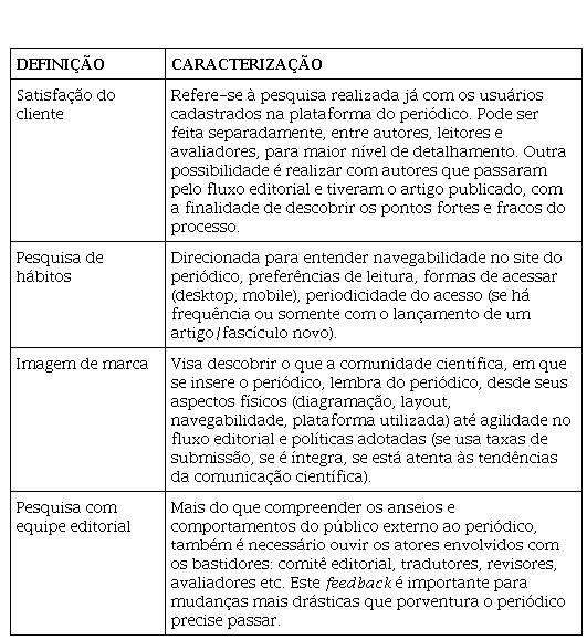 No quadro 1 indicamos os principais tipos de pesquisas de mercado que o editor de um periódico científico pode utilizar: