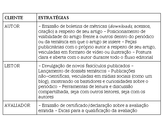 Cada vez mais, as empresas buscam construir uma relação de confiança com o consumidor ao ponto de se desenvolver técnicas para um marketing de relacionamento. Na comunicação científica, é de fundamental importância que o relacionamento com os clientes também seja cada vez mais fortalecido e mais explorado por parte dos editores. No Quadro 2, são indicadas algumas estratégias básicas de marketing para este intuito.