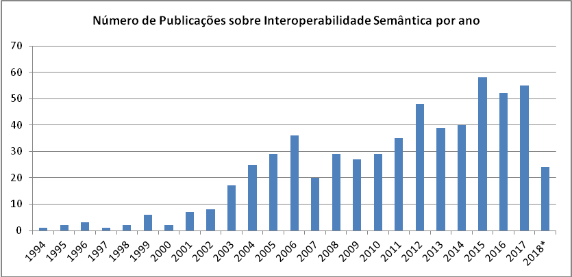 No conjunto de artigos sobre interoperabilidade semântica, sem delimitação de área, os anos das publicações vão de 1994 até 2018. Entre 1994 e 2002, o número de publicações é inferior a dez artigos anuais, e, a partir de 2003 ocorre um desenvolvimento progressivo no número de artigos publicados, o que pode indicar o aumento do interesse no tema. O auge do interesse científico na interoperabilidade semântica parece ter ocorrido em 2015, ano em que se verifica um total de 58 de artigos publicados sobre o tema no conjunto de dados analisados. O gráfico 1 apresenta o número de publicações anuais.