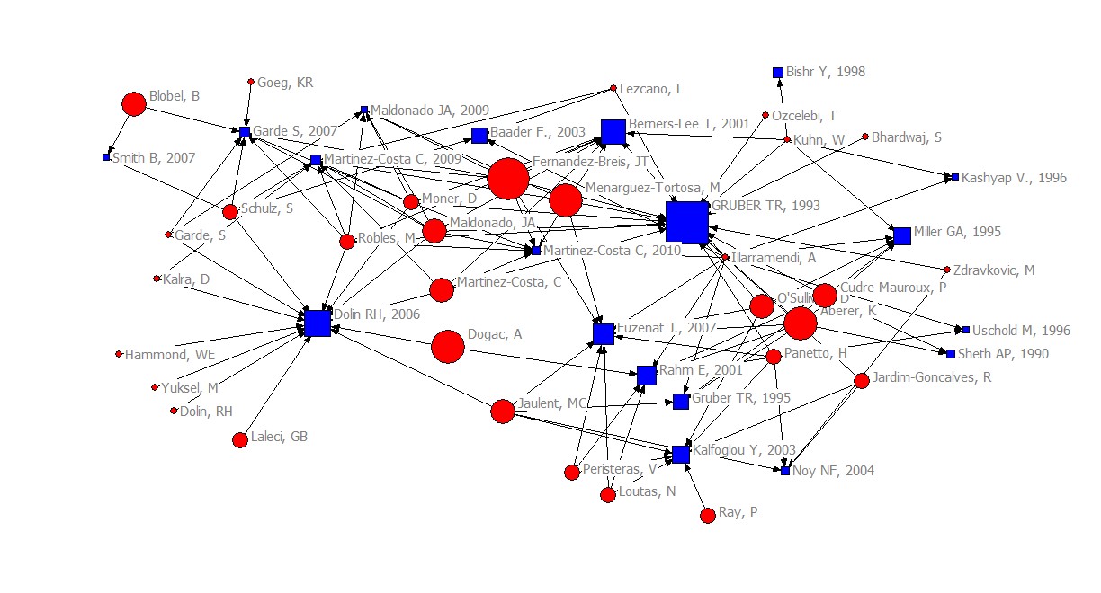 Os círculos vermelhos correspondem aos autores citantes e os quadrados azuis as publicações citadas, o tamanho dos círculos e dos quadrados indicam maior ou menor produtividade dos autores citantes e/ou número de citações às publicações. O autor mais produtivo no conjunto de dados analisados é Fernández-Breis com oito publicações sobre interoperabilidade semântica, e o trabalho mais citado é Gruber (1993), com 47 citações no conjunto de dados bibliográficos analisados, Dolin et al. (2006) é o segundo trabalho mais citado, com um total de 32 citações.