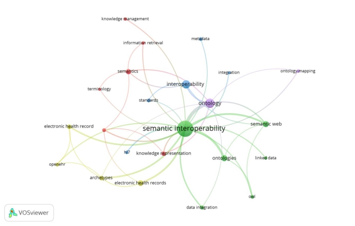 Na análise de coocorrência das palavras-chaves foi possível identificar a formação de cinco clusters que são representados na figura 2 por diferentes cores. Os termos information retrieval, knowledge management, knowledge representation, semantics, snomed ct . terminology integram o cluster vermelho. Os termos data integration, linked data, ontologies, owl, semantic interoperability .semantic web integram o cluster verde. Os termos hl7, integration, interoperability, metadata, standards integram o cluster azul. Os termos archetypes, electronic health record, electronic health records e openehr integram o cluster amarelo. Os termos ontology e ontology mapping integram o cluster lilás. Um cluster não está isolado do outro, mas a ligação entre os termos em cada cluster é mais forte do que a ligação com os termos dos outros clusters. O que indica maior proximidade temática entre os assuntos representados pelos termos de um mesmo cluster.