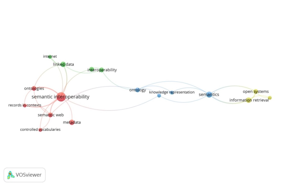 Na análise das palavras-chave, também é possível identificar que o termo ontology é o segundo no ranking, com 75 ocorrências, ficando atrás apenas do próprio termo semantic interoperability, com 216 ocorrências. A figura 2 apresenta a rede de coocorrência das palavras-chave que foram citadas oito vezes ou mais.
